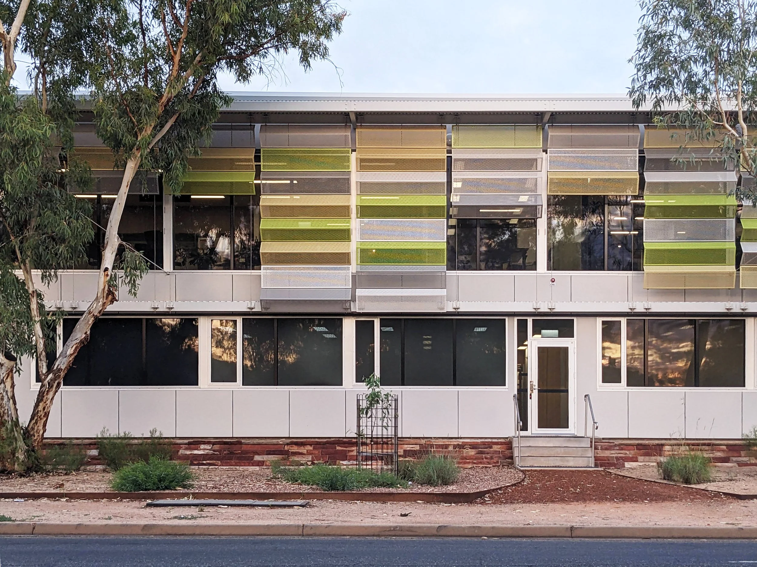 This office development captures the subtle, pretty tones of River Redgum foliage in the adjacent riverbed in a delicate translucent screen on 3 sides of the building.