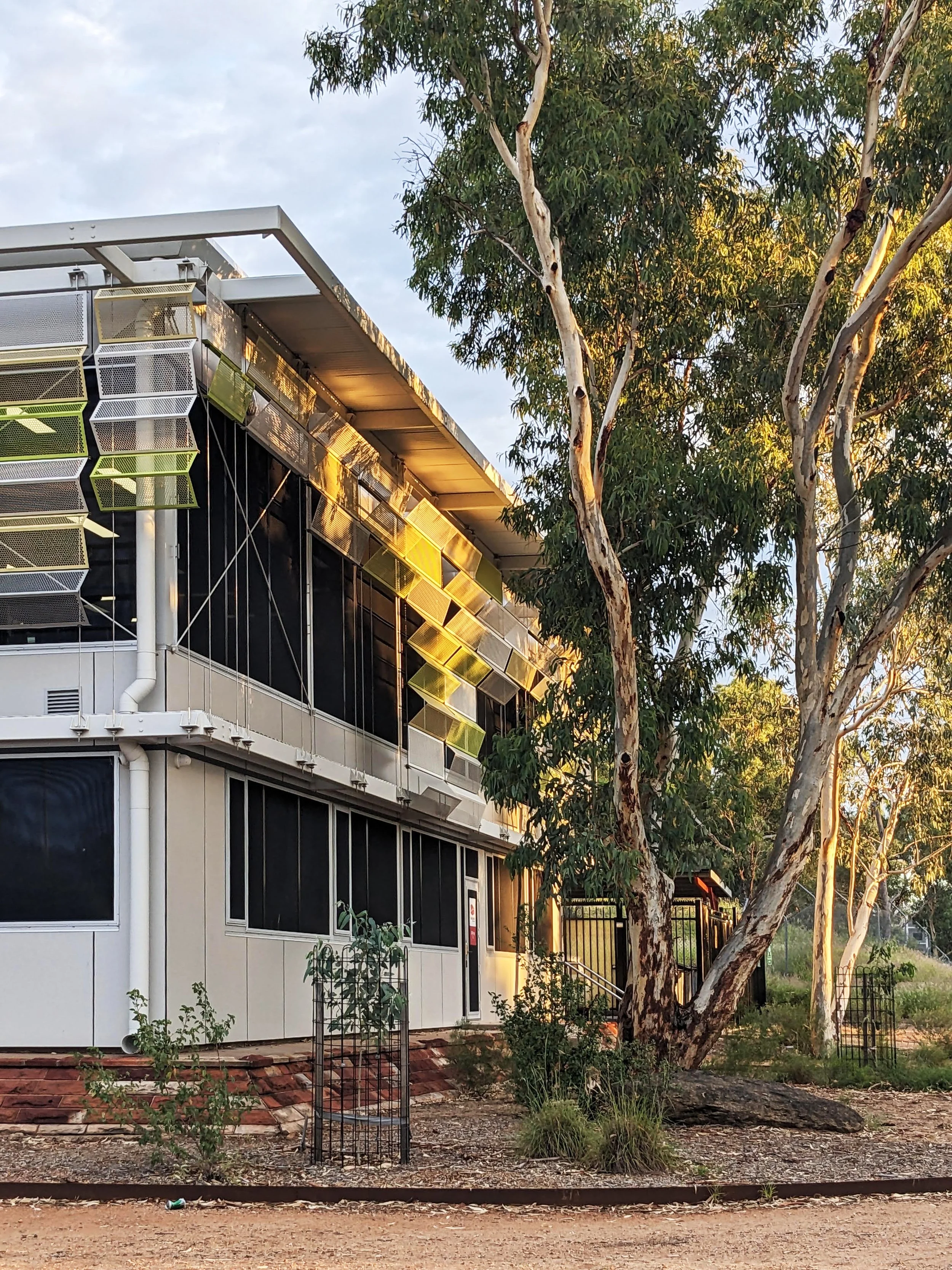 The functional layout includes a zone of meeting spaces with out-of-hours public access, shared with Central Desert Council which occupy the same site. The prominent central stair well features pendant light fittings designed by Tjanpi Desert Weavers and wallpaper designed by APY lands artist Dianne Robinson.